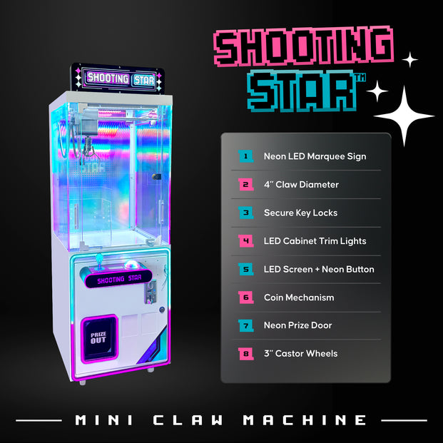 Meet the Shooting Star Mini Claw Machine – the ultimate kid-friendly claw game that delivers out-of-this-world fun in a pint-sized package! Designed just for young players, the Shooting Star Mini brings big excitement with bright LED lights, a colorful cabinet, and easy-to-use controls made for little hands. Its compact size fits perfectly on countertops, small arcade zones, or event spaces — shining bright wherever it goes. Ideal for candy, small plush toys, or fun prizes, this mini claw machine is perfect for retailers, arcades, and family entertainment centers who want to give kids a magical, hands-on experience. Let your space sparkle with the Shooting Star Mini — where every kid gets their chance to shine! 🌟