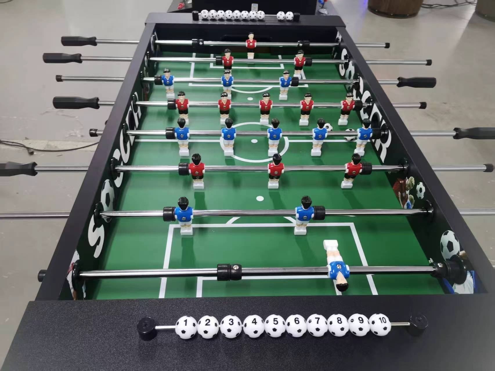 Design: Black cabinet with soccer player graphics and “Soccer” branding