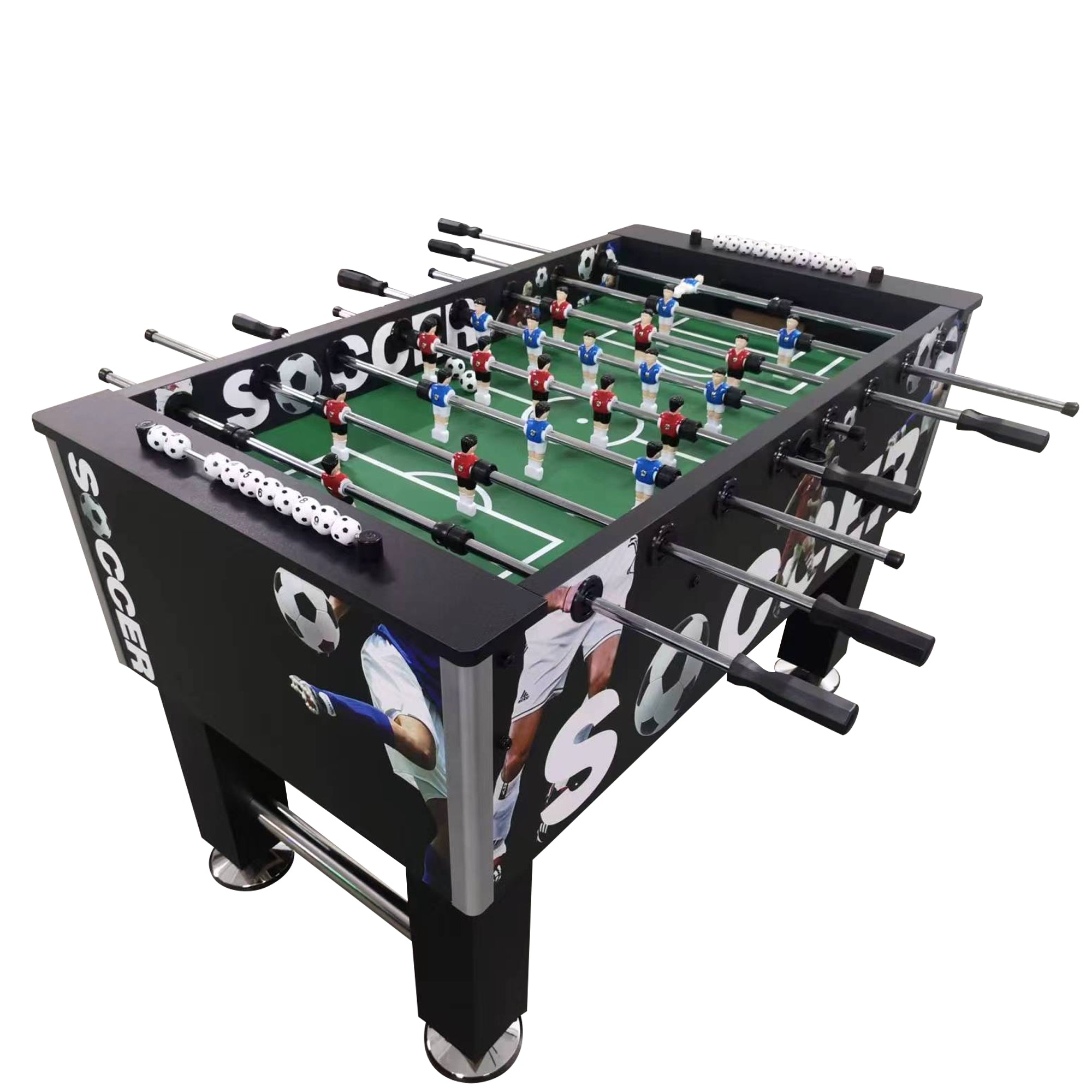 Bring the energy of the pitch into your home with the Goalmaster Select™ Foosball Table | Real Wood Soccer Graphic Premium Foosball Table w/ Soccer Ball Score Markers—a bold fusion of sport-inspired design and professional performance. Featuring a sleek black finish accented with dynamic soccer player graphics and “Soccer” branding along the cabinet, this table delivers an authentic, high-impact look that stands out in any game room. Crafted with a durable real wood build and reinforced structure, it offers smooth, fast-paced gameplay with exceptional stability. The unique soccer ball score markers add a fun, thematic touch that elevates the overall experience. Designed strictly for home use with no coin mechanism, this table ensures uninterrupted play, while the cabinet can be fully custom wrapped for a personalized finish. Whether you're hosting game night or competing at a high level, the Goalmaster Select™ delivers style, durability, and excitement in every match.