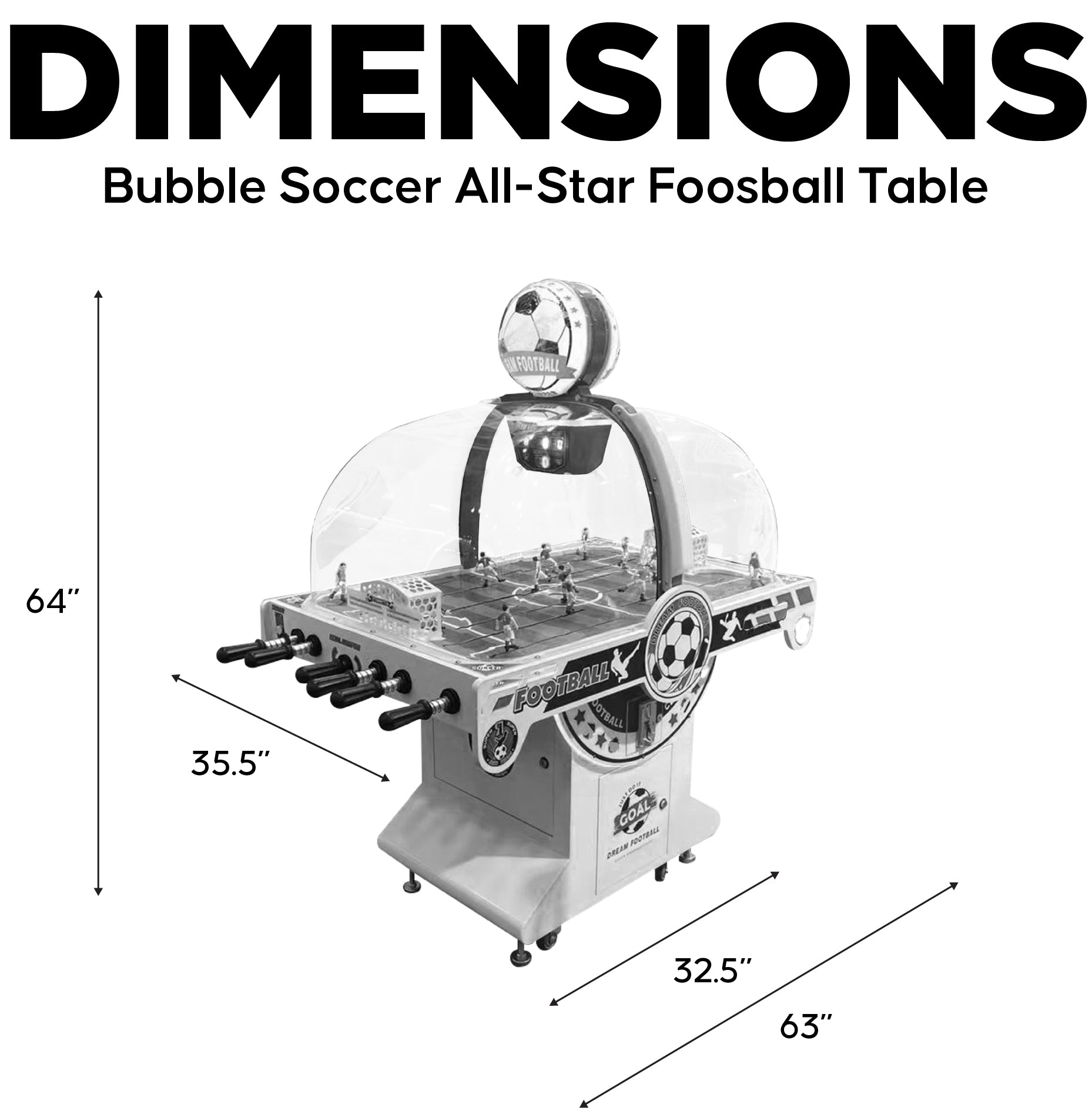 Bubble Soccer All Star™ Foosball Table with Digital Score Board delivers a high-energy, stadium-style foosball experience wrapped in a sleek, illuminated bubble design. Built for commercial environments, this eye-catching table features lifelike 3D soccer player molds, a smooth semi-circular transparent dome, and a bright digital scoring display that keeps every match competitive and engaging. With durable aluminum alloy components, a heavy-duty metal base, and flexible coin-in or free-play operation, Bubble Soccer All Star™ is engineered for reliability, player excitement, and strong earning potential in arcades, family entertainment centers, sports bars, and game rooms.