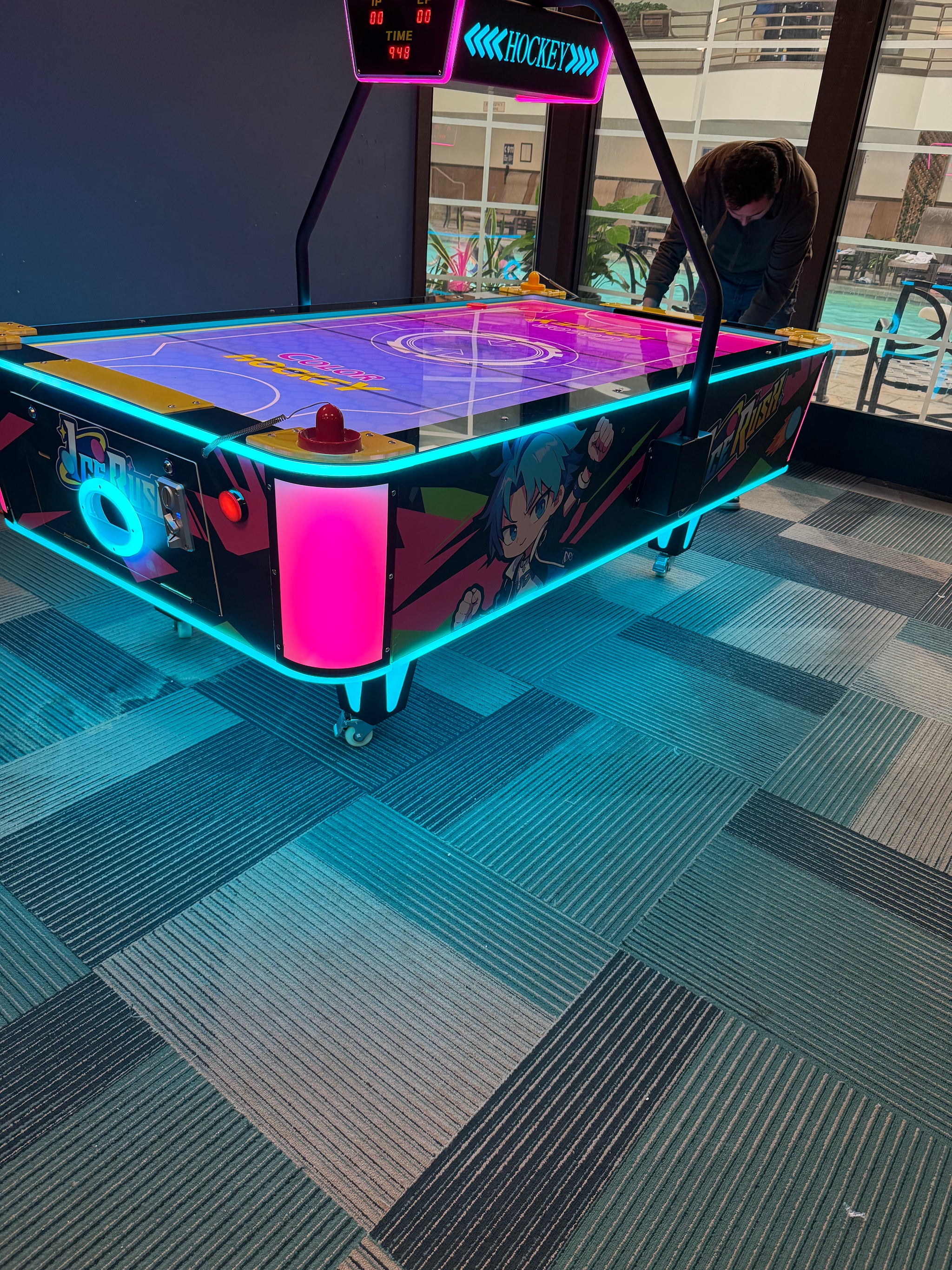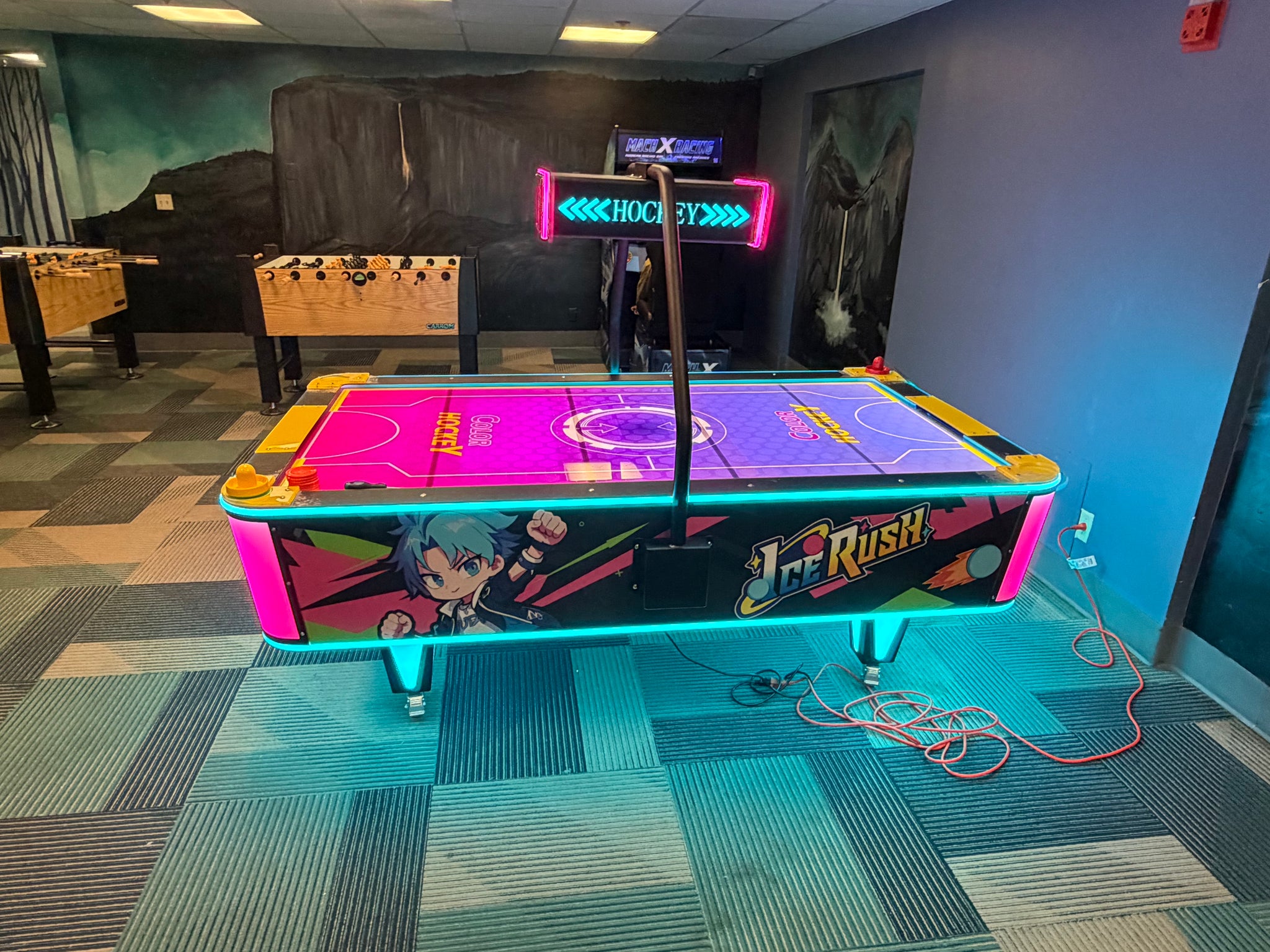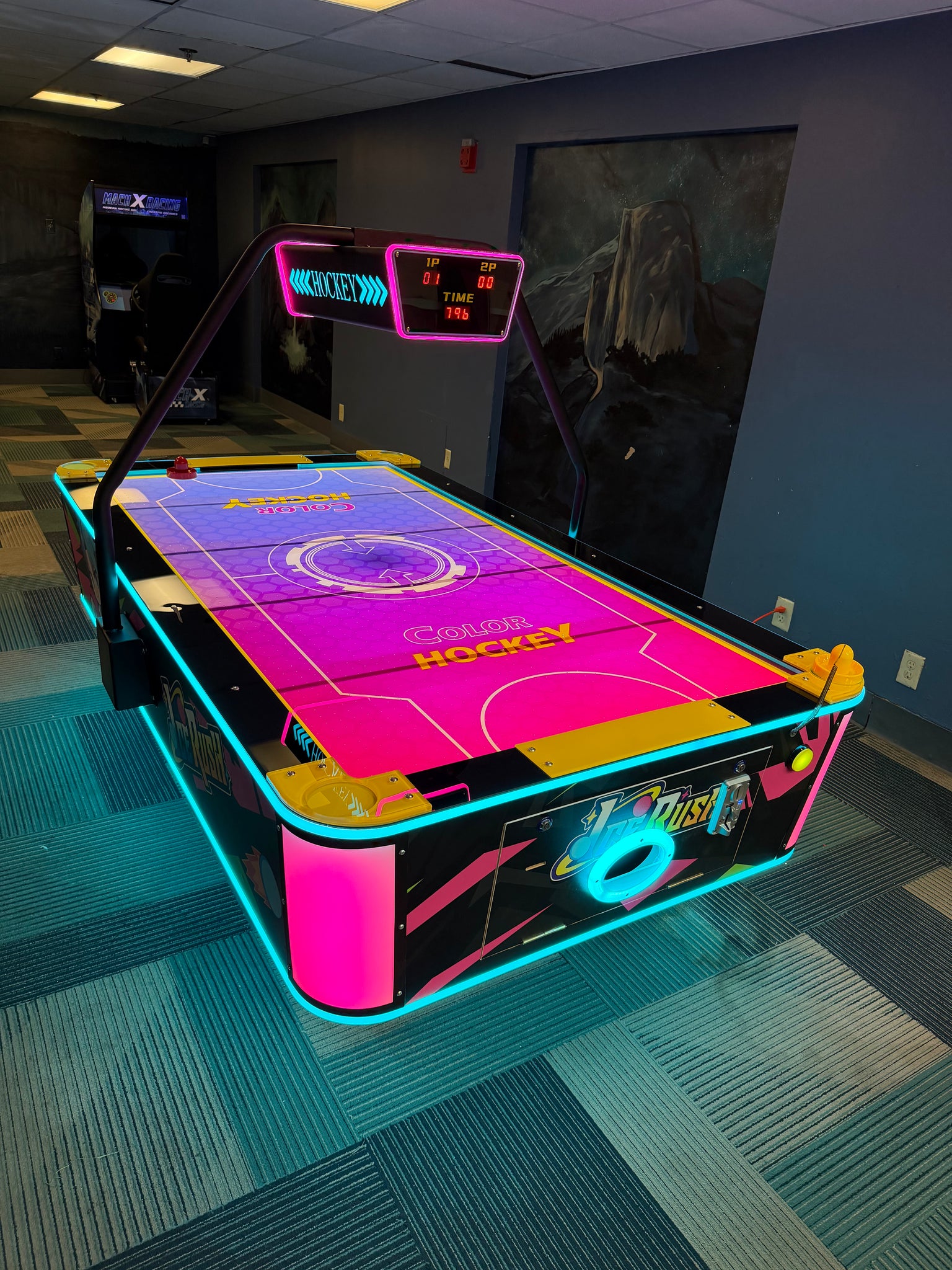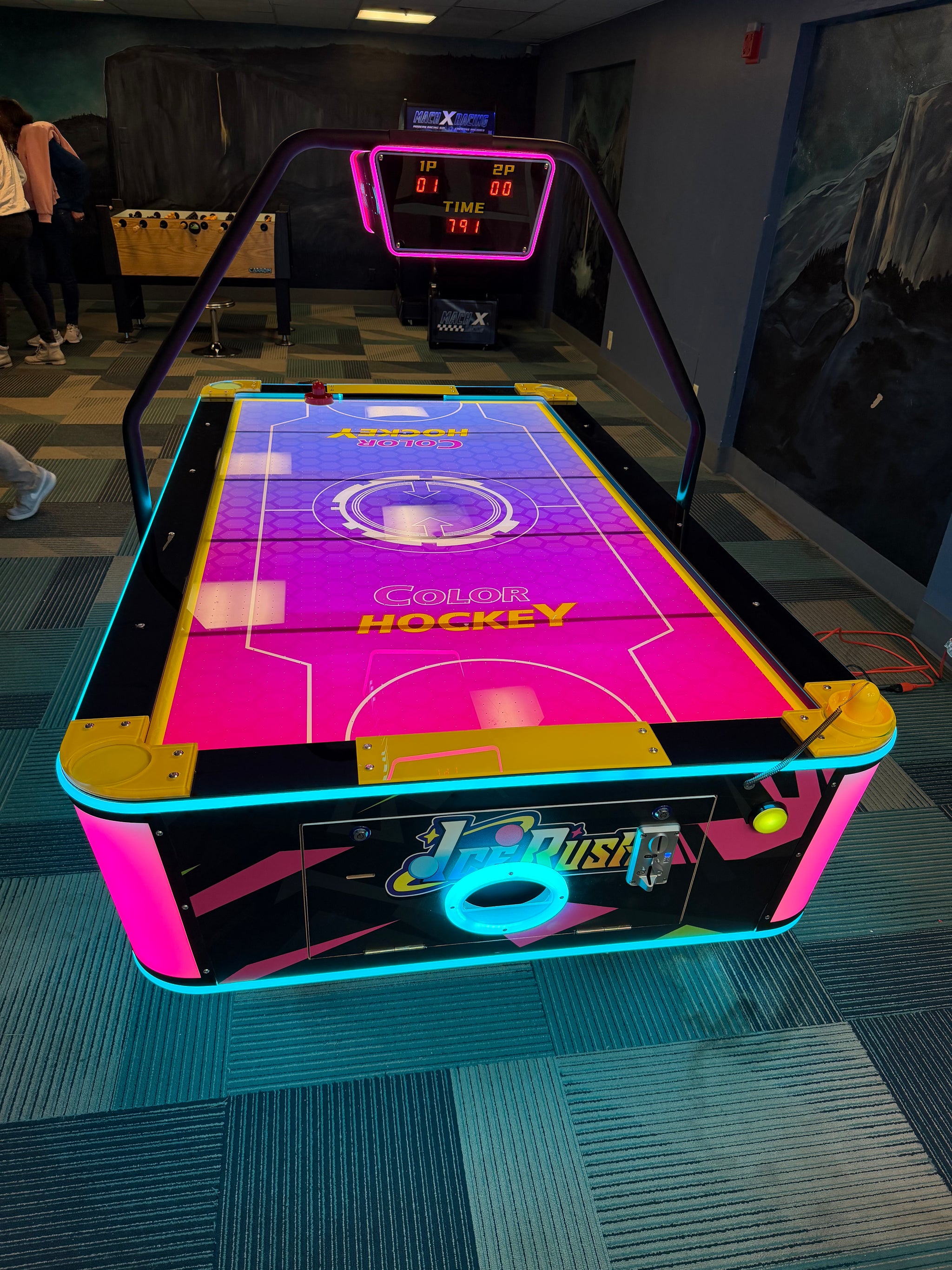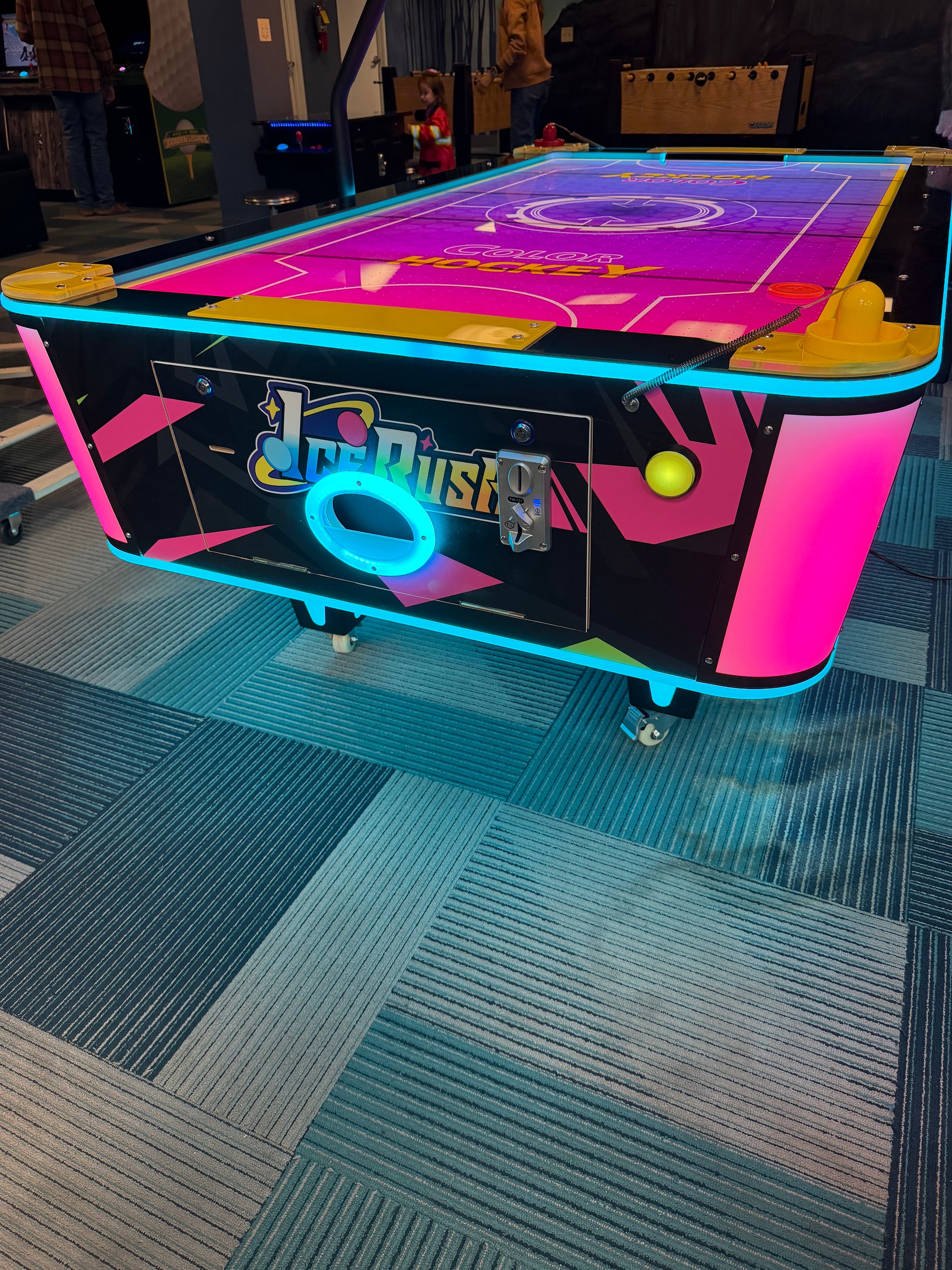 Brilliant neon lighting around the cabinet, legs, and puck return.